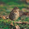 rebondi que chez l’oiseau noir. Le dessus est brun uniforme, la poitrine et le ventre chamois clair largement mouchetés de taches sombres, bien visibles même à quelque distance. Sautille dans l’herbe courte, le bec incliné vers le sol. Peut s’avérer extrêmement confiante en ville, et n’hésite pas à s’approcher jusque dans les pièces ouvertes sur le jardin des maisons habitées.