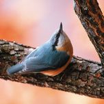 De la taille d’un Moineau, mais avec une silhouette en forme de poire, une queue très courte et un bec long et puissant. Le plumage du manteau est gris bleuté, la face inférieure fortement orangée. Un large sourcil noir prolonge le bec. La Sittelle est l’acrobate des arbres, qu’elle explore en tous sens et dont elle est la seule à pouvoir descendre les troncs la tête la première (et sans tomber !). Peut également visiter une muraille de la sorte, ses puissantes pattes étant sur ce terrain-là tout aussi efficaces. N’hésite pas à se poser au sol pour récupérer les graines tombées des frondaisons.