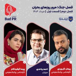 01:01:53||Season 2, Ep. 1قسمت اول از فصل دوم پادکست و ویدیوکست بدپیآر | Bad PR در مرداد ماه ۱۴۰۴ منتشر میشوددر این فصل با عنوان فصل جنگ، به بررسی تاثیرات جنگ ایران و اسرائیل بر فضای ارتباطات، رسانه، برند و بازاریابی ایران خواهیم پرداخت و تجربه شرکتهای ایرانی در این حوزهها را مرور خواهیم کردمن احمد واحدی هستم و در در اولین قسمت از فصل جنگ، با همراهی پریسا فرشیدفام و پیمان گلوردی، ضمن مروری بر فضای کسبوکاری کشور در روزهای جنگ، مهمترین بحرانهای کسبوکارها و اقدامات مسئولیت اجتماعی شرکتها را مرور میکنیمبد پیآر را با این شناسه در یوتیوب ببینید و در اینستاگرام دنبال کنید@badprcastاین اپیزود با حمایت پیندو، بازار آنلاین خرید و فروش بی واسطه کالای نو و خدمات منتشر شده است. فروشگاه اینترنتی پیندو با محوریت تمرکز بر کسب و کارهای متوسط و خرد، فرصت ایدهآلی را برای معاملۀ بیواسطه کالا و خدمات فراهم کرده استشما در پیندو هم میتوانید خرید کنید و هم میتوانید محصول خودتان را بفروشیددر ماههای اخیر علاوه بر امکان انتشار ویدئو برای تعامل بیشتر بین خریدار و فروشنده، ویژگیهای جدیدی مثل خرید امن و اقساطی هم به پیندو اضافه شدهاستwww.pindo.irهمکاران من در این اپیزودتصویربردار و کارگردان: احسان رافتیتدوین صدا: محمد ناظمیتدوین تصویر: محیا تابشصدابردار: پیمان علیمردانیدستیار تصویر: سارا نوروزیطراح کاور: رضا اسماعیلی
