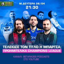 01:23:35|Στο νέο επεισόδιο You'll Never Pod Alone, οι Δημήτρης Βασιλάκος, Παναγιώτης Κιστογλίδης και Θανάσης Χαρίσης σχολιάζουν: Όσα είδαμε στα πρώτα ματς των προημιτελικών του Champions League, με όλα τα ζευγάρια να έχουν πλέον φαβορί! Γρήγορο pre game για την αγωνιστική στα πρωταθλήματα.(00:00) Intro(00:41) CHAMPIONS LEAGUE(01:10) Ρεάλ - Μπάγερν 1-2(17:27) Σπόρτινγκ - Άρσεναλ 0-1(21:55) Παρί ΣΖ - Λίβερπουλ 2-0(34:35) Μπαρτσελόνα - Ατλέτικο 0-2(46:18) Europa League, προημιτελικά(47:03) Ράγιο Βαγιεκάνο - ΑΕΚ(50:35) PREMIER LEAGUE με Τσέλσι - Σίτι(01:08:45) LA LIGA(01:12:45) SERIE A με Κόμο - Ίντερ(01:18:56) BUNDESLIGA(01:21:43) LIGUE 1(01:21:50) Λοιπά Πρωταθλήματα με Χαρτς(01:22:32) Οι προβλέψεις μας για το τριήμερο