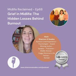 48:45||Season 8, Ep. 68In this solo episode of Midlife Reclaimed, I explore grief in midlife — a powerful but often unrecognised experience for many midlife women, especially those navigating burnout, identity shifts, changing roles, and the emotional transitions of this life stage.When we think of grief, we often think about death. But grief in midlife can also arise through:burnout and recoverychanges in health, energy, or menopause transitionschildren growing up or leaving home or notcareer and identity shiftsageing parents and changing relationshipsthe quiet realisation that parts of our former life no longer fitDrawing on my work as a psychologist supporting midlife women experiencing burnout and mental health challenges — as well as my own lived experience — I explore:what grief in midlife actually iswhy it often goes unnoticedanticipatory grief and life transitionsthe connection between burnout and emotional wellbeingself-compassionate ways to support yourselfIf you’ve been feeling heavier, unsettled, or sensing change within yourself, this episode may help you understand what’s happening — and remind you that you’re not alone.Healing, growth, and reclaiming yourself in midlife are possible.Host: Shannon Swales, Clinical Psychologist, award-winning author, and midlife woman who’s walked through burnout and come out the other side. Shannon combines clinical wisdom with lived experience to support others navigating chronic stress, burnout, and big life transitions. Through gentle conversations and evidence-based insights, she helps women reconnect with themselves, reclaim their energy, and grow through what once felt like breaking points.The Midlife Reclaimed Podcast has been nominated in the Women in Podcasting Awards, recognising podcasts created by women making an impact through meaningful conversations and storytelling. Find out more here https://www.womenpodcasters.com/awards Voting opens in April 2026. We'd love your support.If you enjoy the Midlife Reclaimed Podcast, join our community:• Midlife Reclaimed Online Community - a place to come back home to self - https://midlife-reclaimed.mn.co/• Social Media: Instagram, Facebook, or LinkedIn @shannon.a.swales• 1:1 Therapy: www.shannonaswales.com/therapySubscribe to my Mailing List: www.shannonaswales.com/subscribe and receive a free eJournal to assist in coming home to yourself.Disclaimer: This podcast does not create a therapist-client relationship with Shannon A Swales. The views expressed are general & not a substitute for personalised therapy. If in distress, seek professional help. Remember—you don’t have to face your struggles alone.