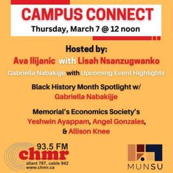 41:33|#CampusConnect, with hosts, #AvaIlijanic & #LisahNszanuganko, and #GabriellaNabakijje with your upcoming campus event highlights!!We've got a spotlight on Black History Month, as Lisah speaks with #GabriellaNabakijje, @bsa.mun Director of Event Planning!PLUS: Ava gets the lowdown on the resurgence of the MUN Economics Society from Co-Presidents #YeshwinAyappam and #AngelGonzales, and Director of Marketing #AllisonKnee.This program aired on CHMR-FM on Thursday, March 7.