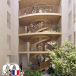 Perspective de l’escalier inspiration « Chambord » en bois, de l’îlot Saint-Martin, conçu par Dominique Perrault