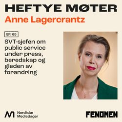36:07||Ep. 65Dagens gjest er toppsjef i Sveriges Televisjon, bedre kjent som SVT. Anne Lagercrantz har vært medieleder i store deler av sin imponerende karriere. Hun har vært innom både TV3, Expressen, TV4 og Sveriges Radio før hun kom til SVT, der hun siden 2024 har vært sjefen for det hele! Under Annes ledelse har allmennkringkasteren gjennomgått store endringer, blant annet på breaking journalistikk og AI - og akkurat nå gjennomfører hun en spareplan på 350.000.000 svenske kroner. I denne episoden snakker hun om samfunnsoppdraget, lederrollen i en ekstremt omskiftelig tid, hva det vil si å ha et «stensikkert kompass» og om hvordan hun møtte Monica Lewinsky. Og om det å være forberedt på krig.