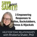 46:52||Ep. 339Being with a narcissistic person is scary, right? You are usually wrong...even when you're right!. You never know what mood they'll be in. They lie, gaslight, rage, and fall silent. They are intimidating! They keep you on edge! What can you do to reduce the intimidation? Listen to this episode. HIGHLIGHTS OF THIS EPISODE:Narcissistic people are likely to engage in several kinds of abuse: verbal, physical, sexual, financial, emotional or spiritual Hijackals use intimidation as a quick way to win, or silence someoneChange your perspective and stop allowing yourself to be les than equal.Use the Personal Weather Report to your advantage I'm here to help. Let's talk soon.RhobertaFOLLOW DR. RHOBERTA SHALER...WEBSITE: https://www.EmergingEmpowered.comPODCAST: http://www.SaveYourSanityPodcast.comNEWSLETTER: http://www.HijackalHelp.comFACEBOOK: https://www.Facebook.com/RelationshipHelpDoctorINSTAGRAM: https://www.Instagram.com/DrRhobertaShalerYOUTUBE: https://www.youtube.com/ForRelationshipHelp-------------------------------------------------------------I'M HERE TO HELP YOU FIGURE OUT WHAT'S GOING ON AND WHAT YOU WANT TO DO ABOUT IT!If you want to learn more, share, ask questions, and feel more powerful within yourself and your relationships,join my Emerging Empowered Community now.Off social media, safe discussion + videos + articles + webinars + 3 group Ask Me Anything calls AND online Emerging Empowered Workbooks with prompts!WOW! Join now. Dr. Shaler's Emerging Empowered Community#narcissstiintimitation #respondingtointimidation #stayingcalmwhennarcissistsareangry#narcissistsbreakpromises #canrustanarcissist #emergingempowered #relationshipincrisis #personalitydisorders #hijackals #narcissist #anri-social#hijackals #emotionalabuse #narcissists #toxicrelationships #breakingthebonds #verbalabuse