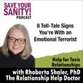 46:52||Ep. 339Being with a narcissistic person is scary, right? You are usually wrong...even when you're right!. You never know what mood they'll be in. They lie, gaslight, rage, and fall silent. They are intimidating! They keep you on edge! What can you do to reduce the intimidation? Listen to this episode. HIGHLIGHTS OF THIS EPISODE:Narcissistic people are likely to engage in several kinds of abuse: verbal, physical, sexual, financial, emotional or spiritual Hijackals use intimidation as a quick way to win, or silence someoneChange your perspective and stop allowing yourself to be les than equal.Use the Personal Weather Report to your advantage I'm here to help. Let's talk soon.RhobertaFOLLOW DR. RHOBERTA SHALER...WEBSITE: https://www.EmergingEmpowered.comPODCAST: http://www.SaveYourSanityPodcast.comNEWSLETTER: http://www.HijackalHelp.comFACEBOOK: https://www.Facebook.com/RelationshipHelpDoctorINSTAGRAM: https://www.Instagram.com/DrRhobertaShalerYOUTUBE: https://www.youtube.com/ForRelationshipHelp-------------------------------------------------------------I'M HERE TO HELP YOU FIGURE OUT WHAT'S GOING ON AND WHAT YOU WANT TO DO ABOUT IT!If you want to learn more, share, ask questions, and feel more powerful within yourself and your relationships,join my Emerging Empowered Community now.Off social media, safe discussion + videos + articles + webinars + 3 group Ask Me Anything calls AND online Emerging Empowered Workbooks with prompts!WOW! Join now. Dr. Shaler's Emerging Empowered Community#narcissstiintimitation #respondingtointimidation #stayingcalmwhennarcissistsareangry#narcissistsbreakpromises #canrustanarcissist #emergingempowered #relationshipincrisis #personalitydisorders #hijackals #narcissist #anri-social#hijackals #emotionalabuse #narcissists #toxicrelationships #breakingthebonds #verbalabuse