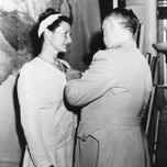 Das Folgenbild zeigt Virginia Hall, als sie 1945 das Distinguished Service Cross vom OSS Chief General Donovan erhält.