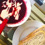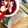 I made us a VEGAN BORSCHT, as ever, click on the bit in capitals for the recipe. And I didn’t know what ‘vegan sour cream yogurt’ was, as I haven’t ever seen that in the UK yet so I stuck some of OTTOLENGHI’S TAHINI SAUCE on the roof instead.