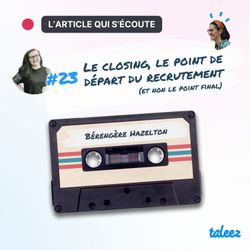 11:10||Saison 1, Ep. 23Depuis toujours, le closing (ou l’offre, la signature, l’acceptation), est vu comme la toute dernière étape du processus de recrutement. Et si nous inversions ce raisonnement ?Imaginez un monde où le closing ne vient pas clore une embauche, mais en poser les fondations. Un univers où accompagner la décision des candidats compterait autant que de les sourcer.C’est une approche incarnée par Bérengère Hazelton, Talent Acquisition Manager chez Lunii, où elle couvre les recrutements stratégiques, la structuration des process et la marque employeur.Ancienne recruteuse externe, elle est convaincue d’une chose : un closing raté, c’est rarement un accident. Il est souvent le symptôme d’un mal plus profond, installé bien avant l’envoi de la promesse d’embauche.Plus qu’une vision, elle partage une méthode, héritée du cabinet, adaptée à l’interne, et surtout très ancrée dans le réel.Article complet à découvrir sur le blog de Taleez.