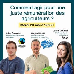 01:03:18|Alors que le revenu moyen d’un agriculteur est déjà inférieur à celui du reste de la population, 22 % d’entre eux vivent sous le seuil de pauvreté. Entre la volatilité des marchés, la pression des intermédiaires et les coûts de production qui explosent, les agriculteurs sont souvent les oubliés de nos étals. Mais des modèles alternatifs émergent. Des modèles qui posent cette question simple : et si on payait le juste prix pour permettre à ceux qui nous nourrissent de vivre dignement ?On en parle avec ceux qui font bouger les lignes :Jules Colombo Responsable des filières françaises de Max Havelaar, acteur historique du commerce équitable, qui garantit un prix plancher aux producteurs, pour leur donner de la visibilité et leur permettre d’investir dans l’avenir.Raphaël Petit, Directeur juridique & affaires publiques de C’est qui le Patron ?!, une marque coopérative née d’un ras-le-bol citoyen, qui permet aux consommateurs de décider eux-mêmes du prix juste à verser aux producteurs.Carine Galante, Chef de projet chez FEVE (Fermes En ViE), qui facilite l’installation de nouvelles générations d’agriculteurs, en mobilisant l’épargne citoyenne pour rendre l’accès au foncier plus juste et soutenir une agriculture respectueuse des humains et du vivant.🎙️ Avec des intervenants engagés, des témoignages de terrain, et des pistes concrètes pour agir ce webinaire s’adresse à toutes celles et ceux qui veulent passer de l’indignation à l’action.