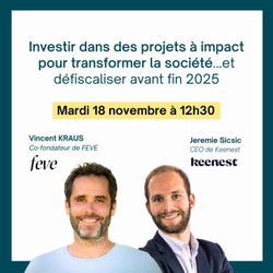 01:00:36|Alors que la transition écologique appelle des investissements à la hauteur de l’urgence, notre épargne reste encore trop souvent en marge de cette transformation.Et si elle devenait enfin un moteur du changement ? Dans ce webinaire, découvrez deux solutions d’investissement engagées pour soutenir des projets qui transforment concrètement notre société.Keenest est une plateforme d’investissement permettant de soutenir des projets innovants à fort impact. Elle sélectionne uniquement des entreprises développant des produits ou des services conçus pour avoir un impact positif sur le climat, en réduisant les émissions de CO2.FEVE, entreprise de l’économie sociale et solidaire, offre aux particuliers l’opportunité d’investir pour financer des fermes agroécologiques et installer la nouvelle génération d’agriculteurs et d’agricultrices.🎙️ Jérémie Sicsic, CEO de Keenest et Vincent Kraus, co-fondateur de FEVE, partage leur expertise et réponde à vos questions.