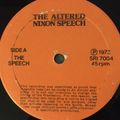 In early September 1973, Syntonic Research, Inc. or "SRI," released a 45rpm single titled "The Altered Nixon Speech." The A-side of the single consisted of a 1 minute audiotape collage of President Richard M. Nixon's August 15, 1973 speech on the Watergate break-in. The collage was created by Irv Taibel, the phonographer who created the "Environments" series of LPs of nature sounds. Using 140 tape splices, Taibel edited Nixon's words to create the following statement (adding some reverb to camouflage the cuts):