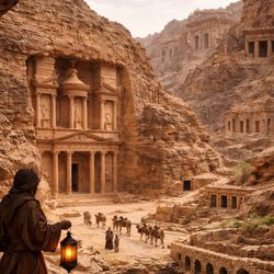 22:29|Petra ligger i dagens Jordanien och var nabatéernas stora stad, byggd i ett bergsområde med smala pass och bra försvarsläge. Staden blev rik på handel eftersom den låg på viktiga rutter för rökelse, kryddor och varor mellan Arabien, Egypten och Medelhavet. Det mest kända är byggnader som är uthuggna direkt i klippan, som Al-Khazneh, men Petra hade också vanliga hus, tempel och gravar. Nabatéerna byggde ett smart system för vatten med kanaler, dammar och cisterner som gjorde att staden kunde fungera trots torrt klimat. Petra tappade betydelse efter romersk kontroll och senare jordbävningar, och återupptäcktes för västvärlden på 1800-talet.