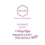 03:29||Ep. 46Day 27 of the #30days30tips on Productivity.Do you favour intensity in the way you work over keeping your energy consistent? This won't help you stay productive sustainably.TL;DR tip of the day: Don't do anything that you won't be able to recover from by the next day. #productivity #ProductivityTips #EnergyManagement #SustainableWork #consistency #intensity #work #academia #academe #research #MindYourOwnRevisions Interested in getting coached for burnout prevention/recovery and a deeper wellbeing? Check out my website: https://www.mindyourownrevisions.com/