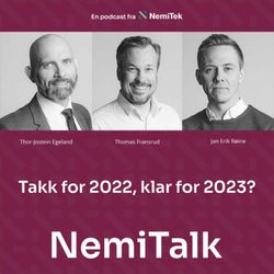 23:45||Season 1, Ep. 1Vi oppsummerer et begivenhetsrikt år, der NemiTek har arrangert flere store konferanser, knyttet bransjen tettere sammen og produsert mye god journalistikk. Vi ser frem til et nytt år der NemiTek satser videre på flere fronter. Med i studio er daglig leder Thor-Jostein Egeland, aktivitets- og kompetansesjef Thomas Fransrud og innholdssjef Jan Erik Røine.