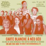 55:38||Saison 1, Ep. 5Néo Géo City s'installe pour ce cinquième épisode Place Pierre Barouh.Fin compositeur-auteur-interprète, voyageur infatigable et créateur du label Saravah, Pierre Barouh a popularisé la bossa nova et la samba brésilienne en France et marqué plusieurs générations de mélomanes par son ouverture d’esprit et son appétit pour les rencontres musicales.Sur scène, voiçi deux duos impressionnants : la chanteuse Sandra Nkake avec le flûtiste Jî Drû et le pianiste Mario Canonge avec le contrebassiste Michel Zenino.Daby Touré, içi en photo chante dans l'acte 1, Avenue Manu Dibango.A l'animation, Isadora Dartial, Armel Hemme, et Smael Bouaci.Et un grand merci à David Blot.A la réalisation, Juste Bruyat , Benjamin Macé , Melvin Schlemer La playlist de Place Pierre Barouh : Pierre Barouh - Samba Saravah, Dubplate Johnny Osbourne (2012), Colette Magny - Gracias A La Vida, Sandra Nkaké & Ji Dû Live - Love Mame Here & Where Are You Now, Mulatu Astatqe – I Faram Gami I Faram, Mario Canonge et Michel Zenino live, Beth Carvalho – Vou Festejar