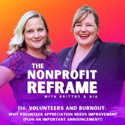 29:23||Ep. 116Volunteers are such an important part of nonprofit organizations, but we don’t always treat them the way we should and it leads to big time burnout. Volunteers give their time because they believe in a cause and want to support it, but so often they get taken advantage of and it needs to stop. In today’s episode, we’re talking about how volunteers need to set boundaries with their time and skills, how we can honor those boundaries by involving them in future planning, and why volunteer appreciation is so vital. Also, we have a bittersweet announcement: The Nonprofit Reframe podcast is coming to an end. Tune in for all the details. What’s in this episode:[00:24] We catch up on the hot weather we’re having, and Nia shares some big news!![05:39] A bittersweet announcement about this show[10:05] Brittny’s confession about working with volunteers[13:24] Volunteers have to set boundaries so they don’t get taken advantage of in terms of time, skills, and compensation[21:21] Volunteer appreciation shouldn’t be “one and done” and should involve succession planning at some point[23:16] Many volunteers donate their time because they can’t donate funds, but still want to be impactful to their cause, and we should recognize their contributionsFor full show notes, resources, links and to download the transcript, visit our website: https://thenonprofitreframe.com/