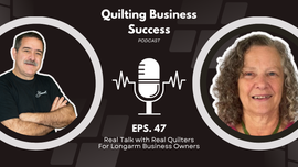 42:46||Ep. 67In this episode of Quilting Business Success, we sit down with Patti Ackerman of Cobalt Quilting in Alexandria, Virginia. Patti shares her 20-year journey in longarm quilting—from discovering quilting through a Bernina class after Desert Storm, to starting her business with a Statler in 2005, to growing a thriving studio that serves both individual quilters and commercial clients.Patti talks about why she chose a computerized machine from the start, how she balanced quilting while working full-time, and the strategies that helped her build her customer base—like partnering with local quilt shops and maintaining professional standards with a dedicated studio space. She also shares how she’s navigated challenges (including a broken foot that sidelined her for months!) and why she still gets excited about each new software update.Whether you’re just starting your quilting business or looking to grow, Patti's story offers inspiration, practical tips, and proof that with persistence, there’s plenty of quilting work to go around.