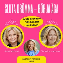 43:23||Season 2, Ep. 1Möt årets grundare Sofie Franzén - "allt handlar om kultur"Sofi startade bolag redan som 23-åring, byggde steg för steg – och visar hur kultur och värderingar kan bli den starkaste tillväxtmotorn. Hon tilldelades guld i kategorin Årets grundare Founder of the Year / Årets grundare (Large Size Companies) på Founders Awards Gala (25 september 2025) för sitt värderingsdrivna arbete med inkluderande och hållbara upplevelser.I avsnittet pratar vi om hur man skapar en arbetsplats man själv vill jobba på, varför “we above me” måste tränas i vardagen, hur man tar sig igenom tuffa perioder (som när marknaden viker) – och vad Sofie önskar att hon hade vetat från start. Vi hinner också in på hennes nya fas i livet: mentor, engagemang i flera sammanhang och hotellprojekt i Jämtland.Sofie har även tidigare prisats som Årets VD 2018 (kategori små företag).👉 Gillar du avsnittet? Följ podden så du inte missar nästa, lämna gärna en rating/recension – och dela avsnittet med en kvinna som sitter på en idé men tvekar