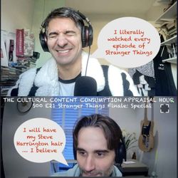 01:02:18||Season 0, Ep. 21STRANGER THINGS FINALE: Reviewed! It’s a Stranger Things finale special! We simply had to do it. Because we share a lot of things in common with Stranger Things. Ultimately, across years and years of episodes … our show is also a show about growing up. A real coming-of-age story, if you will. Just don’t ask for a numerical value of said age. And also … despite all manner of tangents and unexplored B-stories, the true meaning of both Stranger Things and the Cultural Content Consumption Hour is obviously: friendship. Awwww. So there. Eat that, haters. Do we have any fun for you in the show notes today or what? Firstly, we have joined the internet discourse just saying all the things about the Duffer brothers. ALL THE THINGS. Well not all the things. The internet is on a mad one, as ever. We’re barely saying some of the things. Scratching the surface of some of the things. But good, we deserve our say also. On this day of all days, a week after the finale dropped … and, the day after secret episode was supposed to drop: https://www.bbc.co.uk/bitesize/articles/zrk83qtHahaha remember when there was supposed to be a secret album after The King of Limbs? Lol. And also, we got to get into our feels! Love a series finale! Love some zeitgeist! And after literal *years* of hosting a cultural review show together, we love suddenly talking about the last episode of a show that we have both watched the entirety of that we have somehow never talked about before!Welcome to … *the last special* … for now? TO BE CONTINUED!Variety’s chat with the Duffer brothers sheds some light: https://variety.com/2026/tv/news/stranger-things-finale-is-eleven-alive-vecna-killed-rock-spinoff-1236621528/Finn Wolfhard directed a George Harrison video. That’s 1 more song by a Beatle he’s directed a video for than any of us have so fair play mate: https://www.youtube.com/watch?v=P0d_P11B6TgThe My Mom’s Basement boys talk about the Stranger Things with more of a vibes and details approach as opposed to our vibes, some whimsy and more vibes one: https://www.youtube.com/watch?v=BZDPGV8V3vgTaskmaster announcement vid: https://www.youtube.com/watch?v=1OP6DuihCnkKumail is sad about Eternals: https://www.youtube.com/watch?v=2x19a62o1Co&t=10sTweet of the week via Ryan Satin: https://x.com/ryansatin/status/2007219967687831706Check out our website: cccappraisalhour.showCheck out our e-mail: cccappraisalhour@gmail.comCheck out our Twitter: twitter.com/cccappraisalpodCheck out our YouTube: https://www.youtube.com/@cccappraisalhourCheck out our Instagram: https://www.instagram.com/cccahourSpecial FAVE MOMENT FROM THE POD RECORD note for VIP read-the-whole-show-notes-members only: When Christopher went in on Jonathan Byers. He called him “wet” lol. If Christopher had been a character in fictional Hawkins and given Jonathan that kind of guff on the show, he basically would have been the high school bully! Winona Ryder would have kicked his ass!! We can dream, I guess. SPOILERS BELOW FOR NEXT WEEK’S #REVIEW1THING CONTENT:https://www.youtube.com/watch?v=TvXhCayQXkc&t=2102s