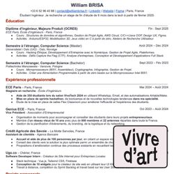 02:15||Saison 1, Ep. 31Des conseils pour votre Resume/CV venant de mon ami Adrien qui ont marché pour moi.À l'américaine/finance, pas de photo, une seule colonneTrès dense, marges faiblesQue du concret, des chiffres, du résultat (Data Driven)School, Experience, Projects en grosses partiesLanguages, Certifications, Interests en petit en basSuivre le template de FryingPan : https://docs.google.com/document/d/1mtr1aT1e6UJDZKaHJdcYWxz_eUK4R0Rv/edit