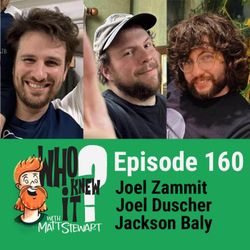 01:18:35|Who Knew It with Matt Stewart is a comedy game show podcast hosted by Australian comedian Matt Stewart. Episode 160 features comedians Jackson Baly, Joel Zammit and Joel Duscher from Plumbing the Death Star!Check out Matt's new stand up special: https://youtu.be/ZgukEPerWZc?si=SW8PttGAB-ly_GF8And his last stand up special: https://youtu.be/cWStRpI-BhESupport the show via http://patreon.com/dogoonpod and you can submit questions for the show!See the podcast/Matt live: https://www.mattstewartcomedy.com/Check out Matt's podcast network: https://dogoonpod.com/Theme song by Evan Munro-Smith, Logo by Murray Summerville and edited by Connor Schmidt!