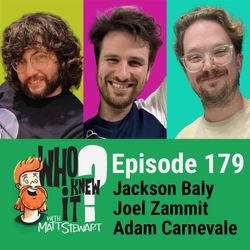 01:42:44|Who Knew It with Matt Stewart is a comedy game show podcast hosted by Australian comedian Matt Stewart. Episode 178 features comedians Jackson Baly, Joel Zammit and Adam Carnevale!Support the show via http://patreon.com/dogoonpod and you can submit questions for the show!Check out Matt's new stand up special: https://youtu.be/ZgukEPerWZc?si=SW8PttGAB-ly_GF8And his last stand up special: https://youtu.be/cWStRpI-BhESee the podcast/Matt live: https://www.mattstewartcomedy.com/Check out Matt's podcast network: https://dogoonpod.com/Theme song by Evan Munro-Smith, Logo by Murray Summerville and edited by Connor Schmidt!