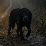 You whirl. Nothing. The padding sounds circle you, stalking you. A shape melts out of the hedge – eyes like blazing saucers, black shaggy bulk the size of a small donkey, chain links clinking faintly. It blocks the road. If you speak… if you strike… it gains power over you.